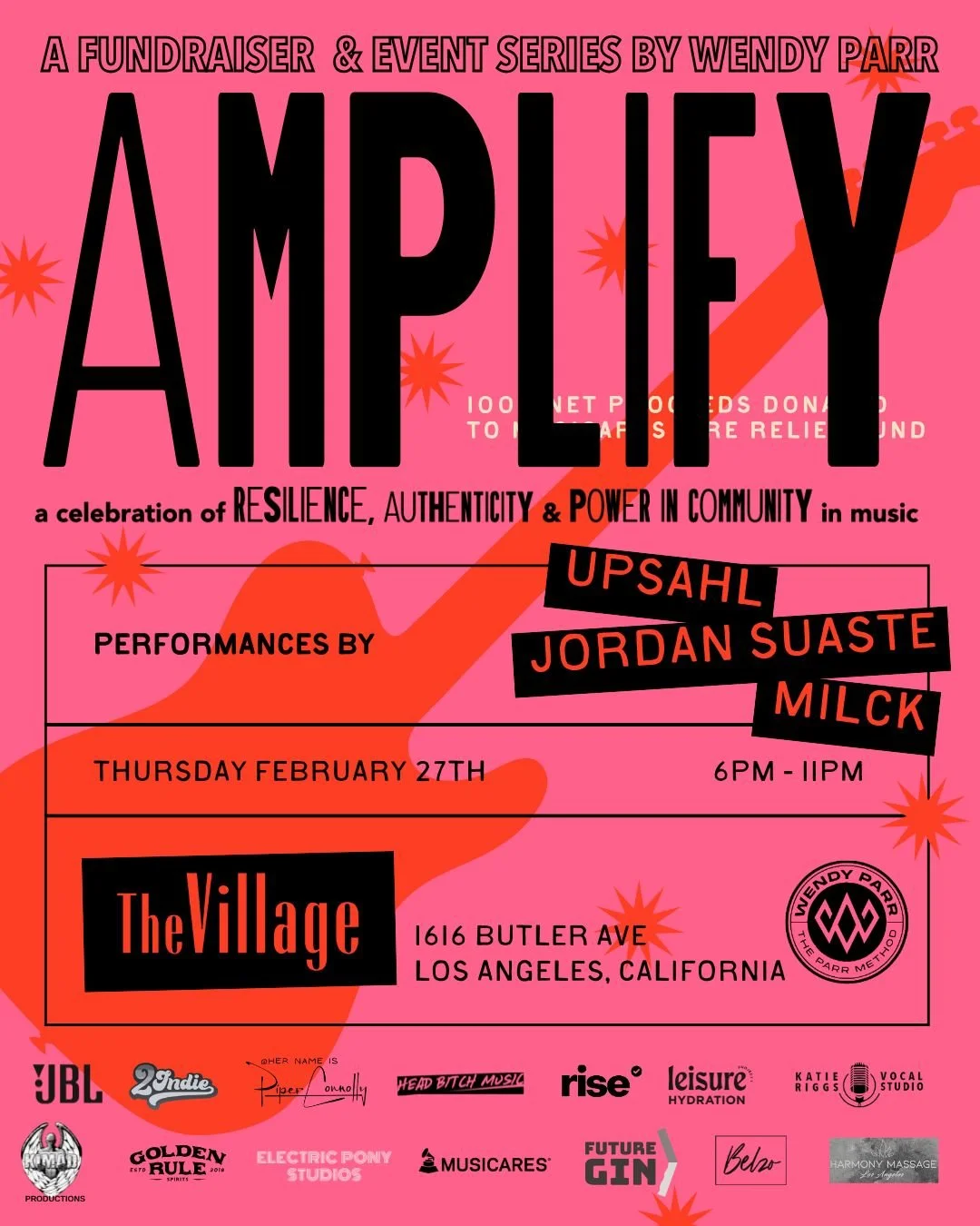 Back in Los Angeles, I’m thrilled to announce the Amplify Fundraiser, taking place on February 27th. This event is especially close to my heart as it’s raising funds for MusiCares to support those who have been affected by the recent fires in LA. We’re gathering the community to share music, libations (OPEN BAR ‘til we run out!) offer gear, artist services and other in kind donations, a Silent Auction - including voice lessons from a couple of my amazing colleagues!, myofascial massage, a JBL Playbox + more - All to help those who lost so much during the tragedy.