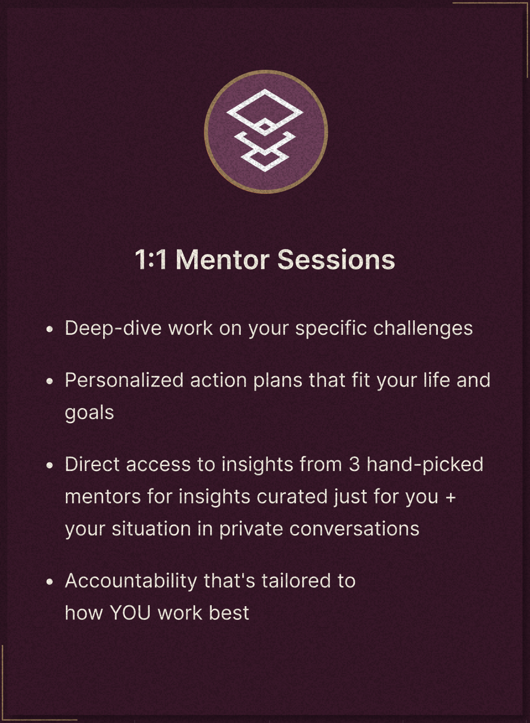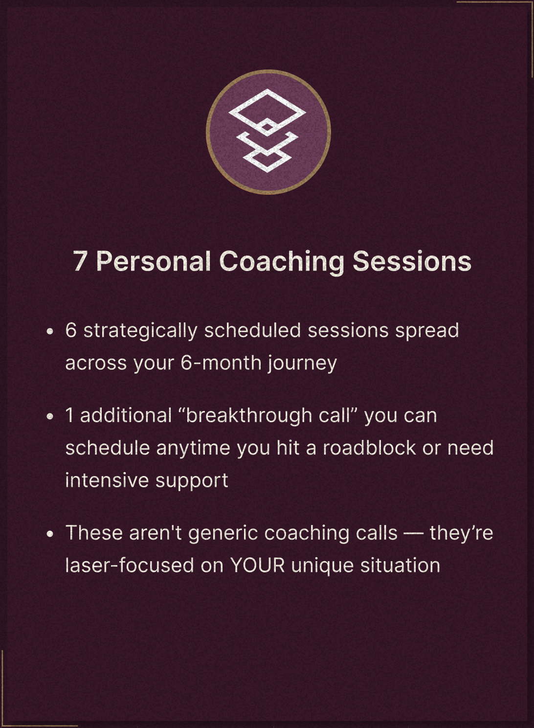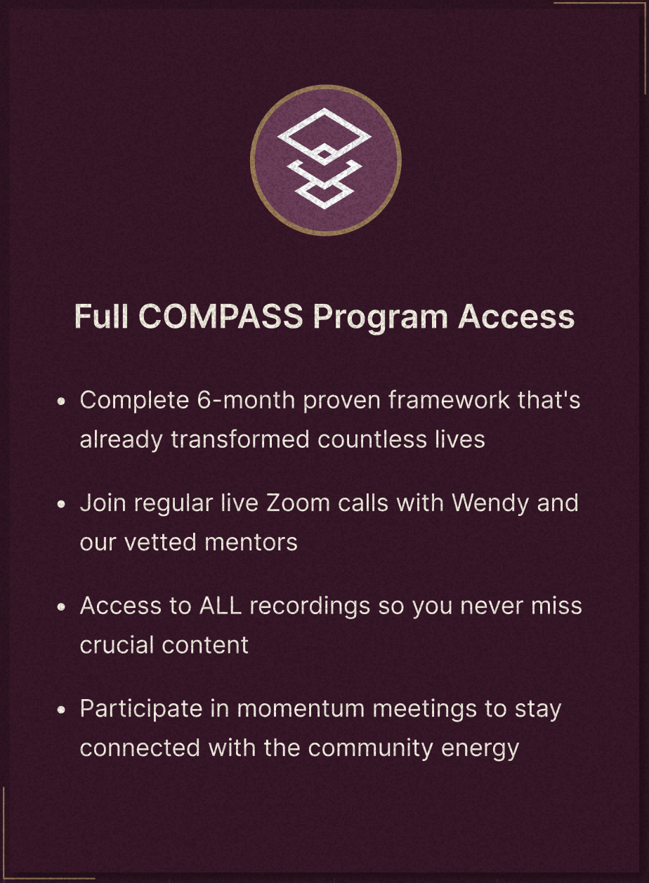 I hear you. While group programs offer incredible value and community, sometimes you need that deeper, more personalized approach to create the breakthrough you're seeking. That's exactly why I created COMPASS PLUS — for driven individuals like you who want all the proven framework benefits with the intimate guidance that only comes from dedicated 1:1 mentorship.